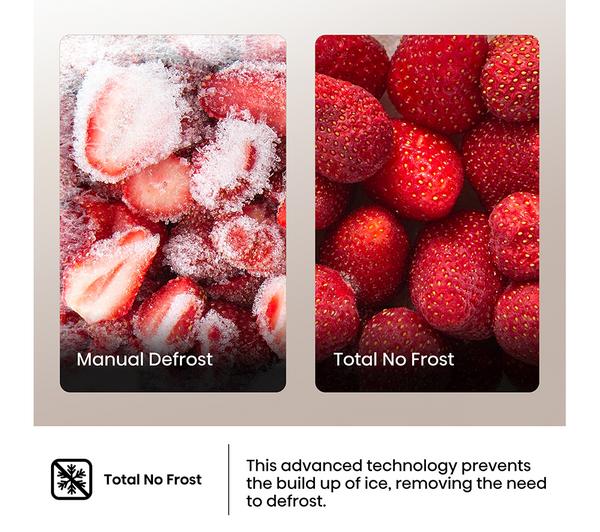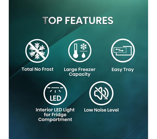 The Hisense RB327N4BBE 50/50 Fridge Freezer combines advanced Total No Frost technology with practical design. It prevents ice build-up by evenly circulating cold air, eliminating the need for manual defrosting. The integrated wine rack securely holds up to five bottles, ideal for entertaining. Its reversible doors offer flexible installation to fit any kitchen layout. Inside, a soft LED light enhances visibility while being energy efficient. The 90° door design allows full drawer access even when the door is partially open, and an adjustable control dial lets you easily set the desired temperature for optimal food preservation.