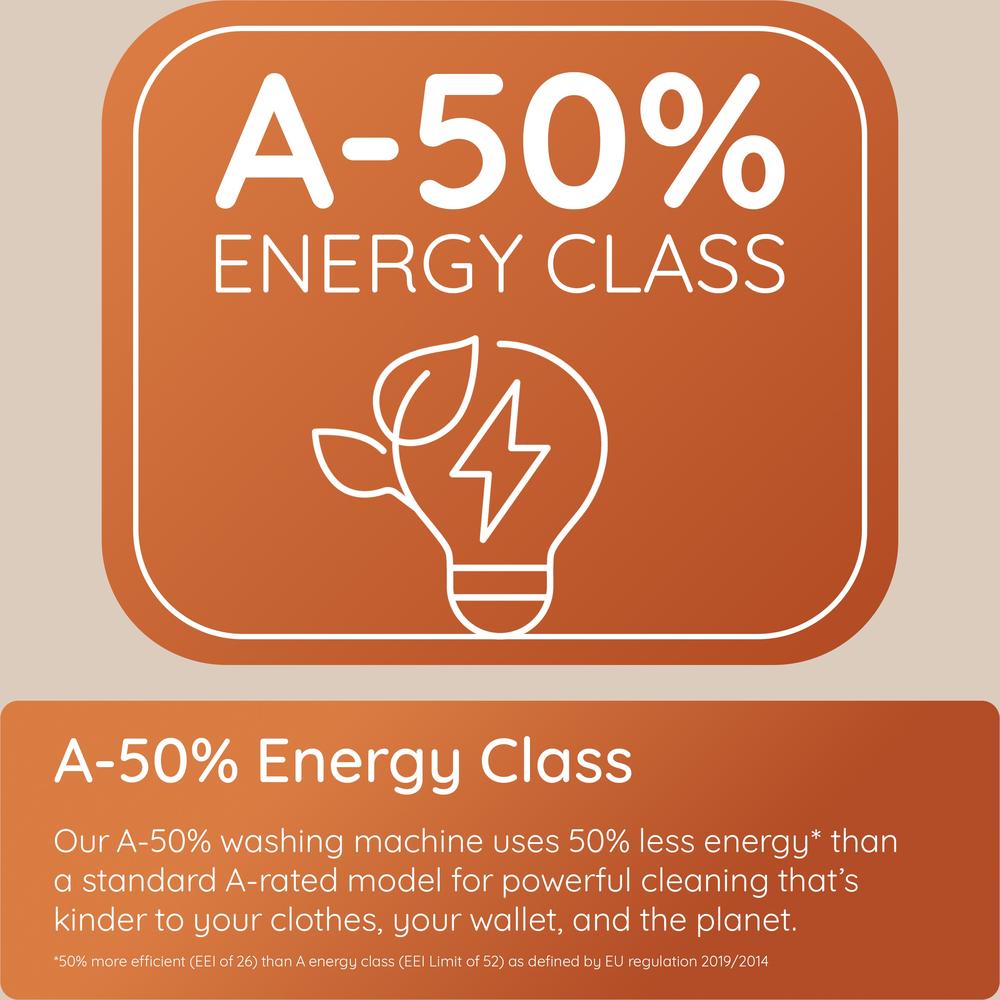- A-50% Energy Rated – Uses up to 50% less energy than standard A-rated models